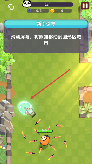 1、跟隨新手引導(dǎo),滑動屏幕操控熊貓移動,精準(zhǔn)進(jìn)入圓形區(qū)域,熟悉基礎(chǔ)操作邏輯。