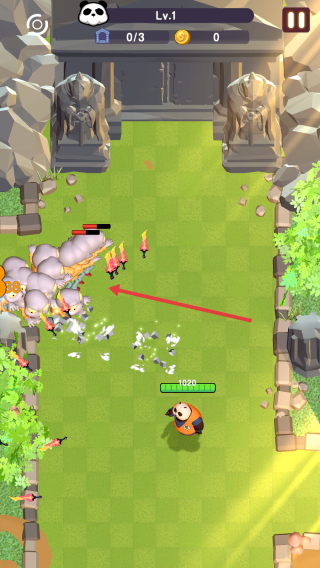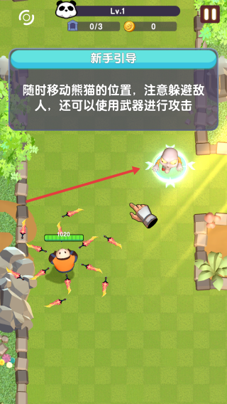 2、遇敵人時,靈活滑動改變熊貓位置躲避,點(diǎn)擊武器圖標(biāo)攻擊,掌握攻防節(jié)奏,推進(jìn)關(guān)卡。