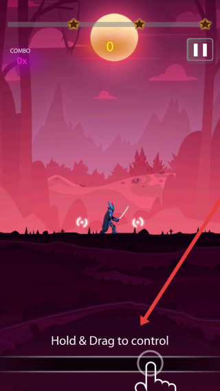 1、在游戲初始界面,按住底部Hold&Drag-to-control區(qū)域拖動(dòng),操控武士在月夜場(chǎng)景移動(dòng),準(zhǔn)備迎戰(zhàn)敵人。