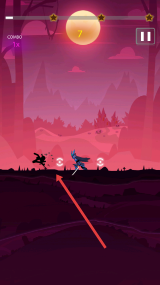 2、拖動(dòng)屏幕控制武士移動(dòng)方向,揮刀攻擊黑色敵人,積累Combo與分?jǐn)?shù),推進(jìn)關(guān)卡戰(zhàn)斗進(jìn)程。