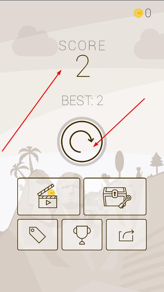 3、角色失敗后,界面展示當前SCORE如2與BEST記錄,點擊中間重置按鈕,重新開始挑戰(zhàn),沖擊更高分數(shù)。