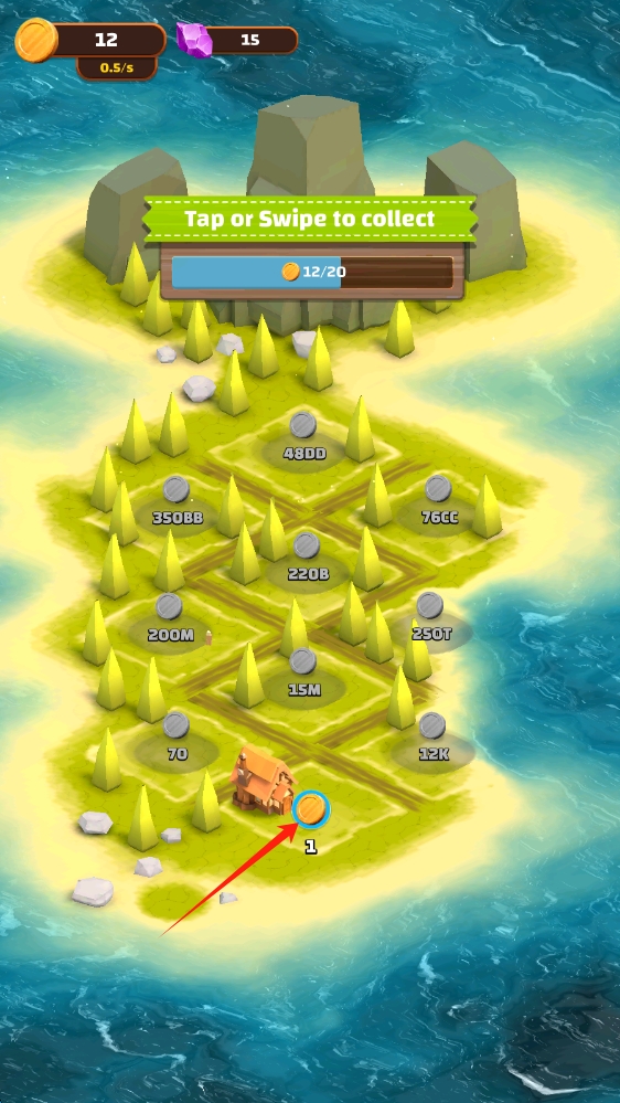 1、在島嶼經(jīng)營(yíng)游戲界面,點(diǎn)擊或滑動(dòng),積極收集金幣,完成20個(gè)的收集目標(biāo)。