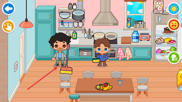 2、在庭院與角色對話、玩耍,進入房屋,如廚房后,操控角色進行活動,如打掃、烹飪,觸發(fā)互動劇情。