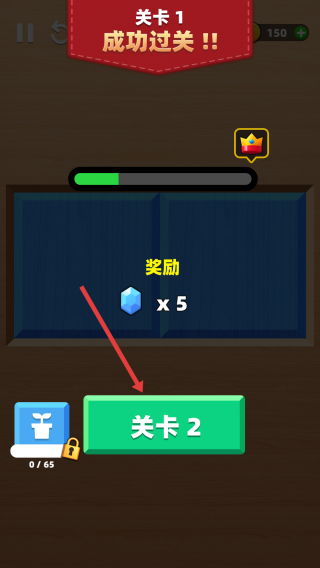 2、當(dāng)成功完成關(guān)卡1后,你會看到成功過!的提示,并獲得相應(yīng)的獎勵,比如5個藍(lán)色的寶石。此時,點(diǎn)擊關(guān)卡2按鈕,即可進(jìn)入下一個關(guān)卡,繼續(xù)挑戰(zhàn)。