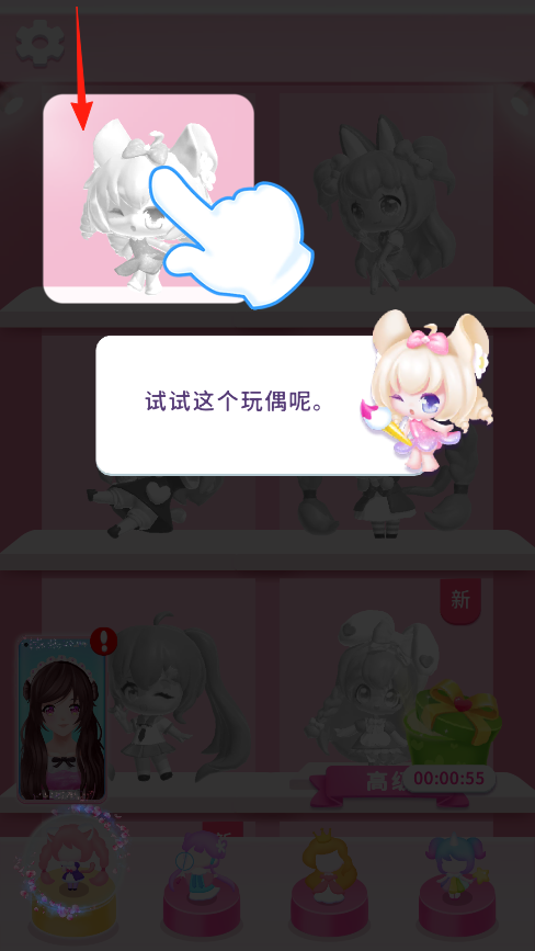 2、彈出框會推薦新玩偶給你,點試試這個玩偶呢就能預(yù)覽金發(fā)玩偶的效果,架子上帶新標(biāo)簽的是限時款式,倒計時結(jié)束前要抓緊機(jī)會收集哦。