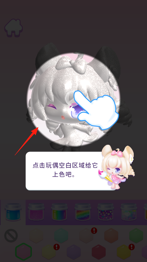 3、直接點擊玩偶灰色部位就能上色,底部顏料罐提供了超多顏色選擇,涂色時那個拿畫筆的小女孩會給你提示,想換顏色隨時點其他色塊就行,涂錯的地方也能重新修改。