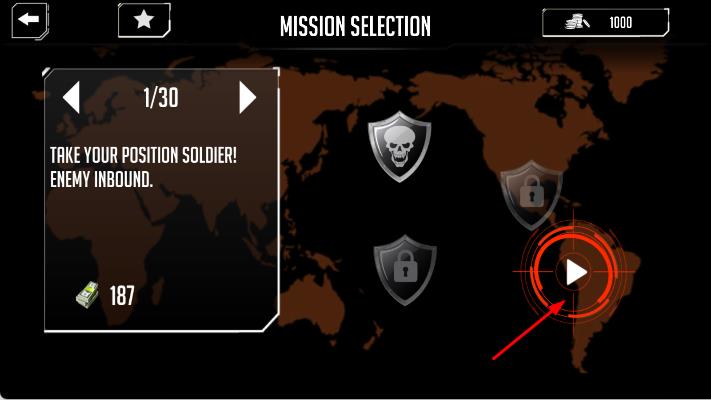 1、進(jìn)入游戲,在任務(wù)選擇界面,選擇可進(jìn)入的任務(wù),通過右側(cè)的虛擬按鈕進(jìn)行瞄準(zhǔn)和射擊操作,利用手中的武器射擊眾多的目標(biāo)敵人。