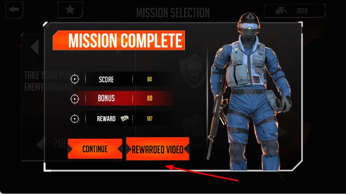 3、當(dāng)成功消滅所有目標(biāo)敵人后,完成任務(wù),顯示任務(wù)完成提示,可以選擇CONTINUE進(jìn)入下一個(gè)任務(wù)。