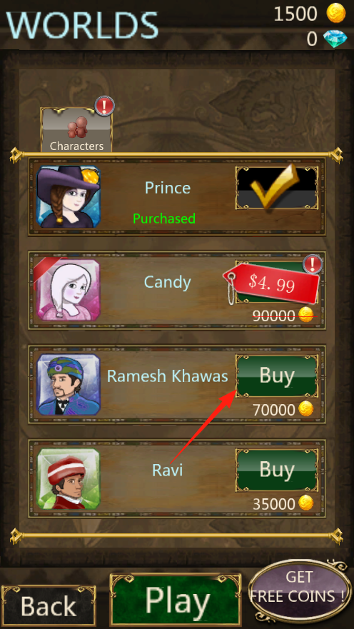 3、已購買的王子角色可以直接使用,想解鎖Candy要么氪金4.99刀要么攢9萬金幣,看到紅色箭頭沒,系統(tǒng)推薦你先買7萬金幣的Ramesh,性價(jià)比比3.5萬的Ravi更高些。