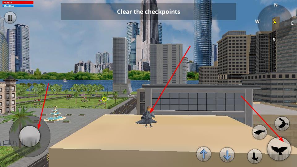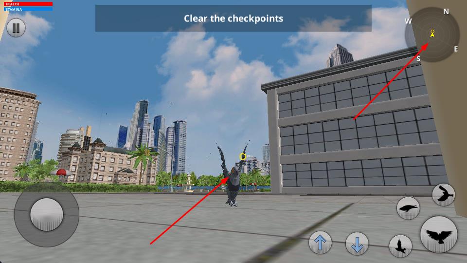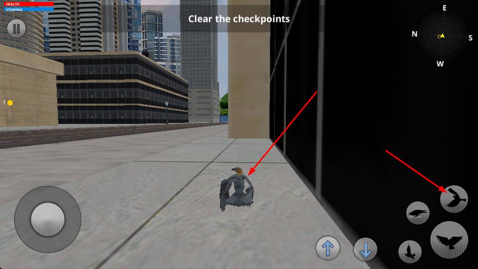 1、進(jìn)入游戲界面頂部浮現(xiàn)Clear the checkpoints任務(wù)提示,左側(cè)虛擬搖桿調(diào)控角色移動(dòng)方向,右側(cè)點(diǎn)擊鷹形等飛行形態(tài)按鈕,切換姿態(tài),開啟城市空域的冒險(xiǎn)征程。