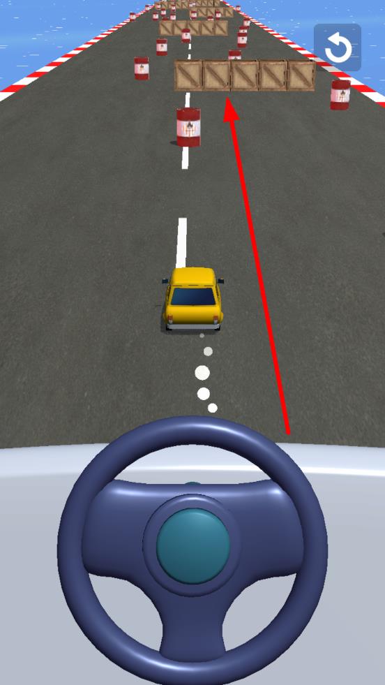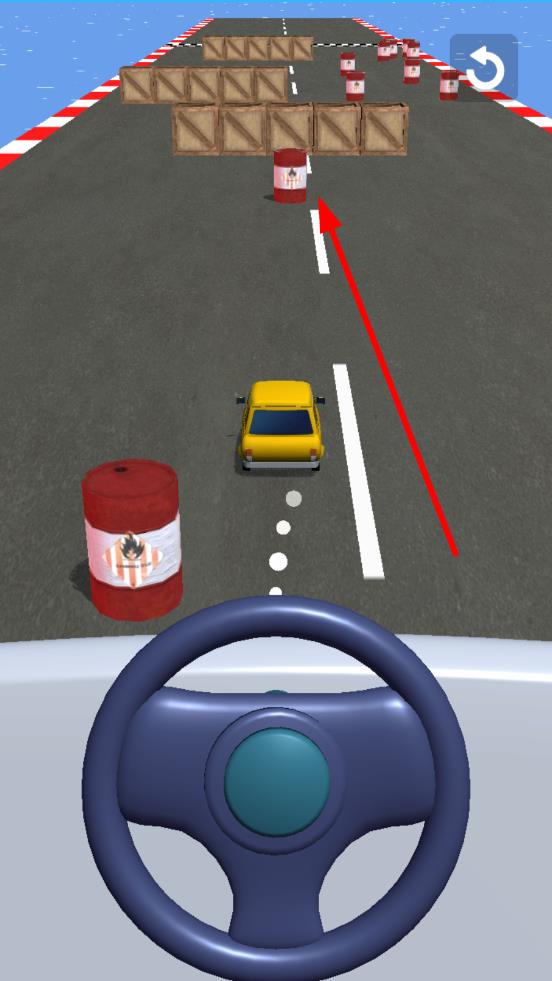 1、點(diǎn)擊進(jìn)入關(guān)卡,握住虛擬方向盤(pán),小車(chē)會(huì)自動(dòng)前行,觀察前方木桶、油桶分布,輕轉(zhuǎn)方向盤(pán)調(diào)整小車(chē)前進(jìn)路線,避開(kāi)碰撞障礙。
