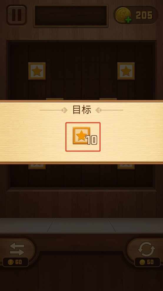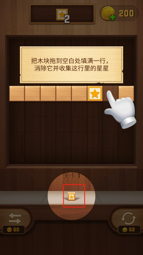 2、依據(jù)指引,將帶星星的木塊拖至對應行空白位置,通過填滿一行來消除并收集星星,優(yōu)先選擇缺塊少的行填充。