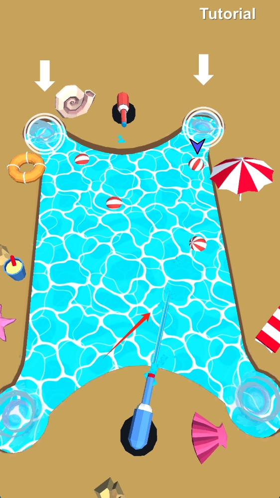 2、Tutorial教程中,按箭頭指引,推動泳池內(nèi)的球,熟悉游戲操作機制,按住發(fā)射水槍。