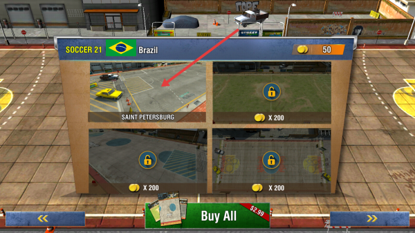 1、點(diǎn)擊主界面PLAY,進(jìn)入場(chǎng)地選擇頁,可解鎖SAINT PETERSBURG等場(chǎng)景,開啟街頭足球國家對(duì)抗賽。