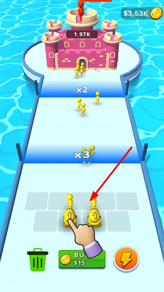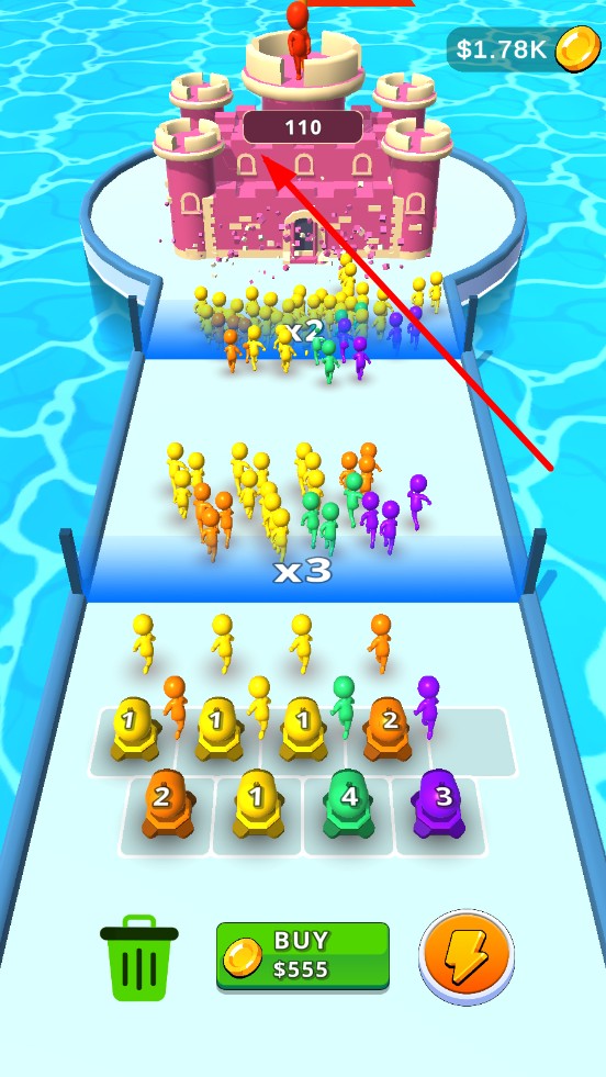 2、將小人合并后,獲得更高等級的小人,點擊右下角雷電圖標,加快小人沖刺速度,朝著敵方城堡沖刺,觀察敵方城堡血量。