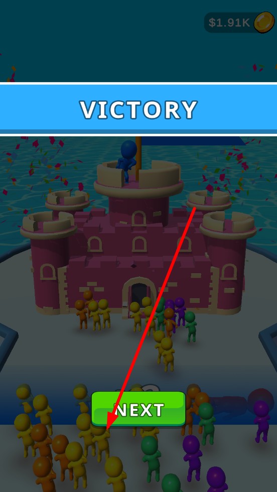 3、城堡破壞反饋:小人進攻時,城堡磚塊逐片崩裂,血量條實時變動;最終占領(lǐng)時,城堡顏色替換為己方主色,視覺反饋強化玩家的勝利成就感。