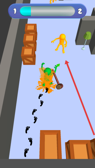 2、在關卡中操控綠色角色,借助錘子追擊黃色目標,跟隨腳印移動,攻擊目標以推進上方進度條,完成當前關卡任務。