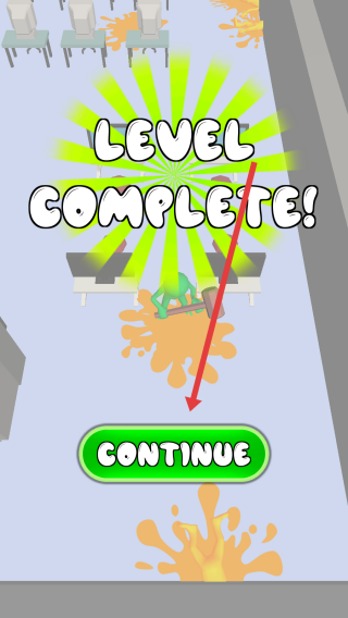 3、成功擊敗目標后,界面顯示LEVEL-COMPLETE,點擊綠色CONTINUE按鈕,領取獎勵并進入下一關,繼續(xù)職場發(fā)泄的游戲進程。
