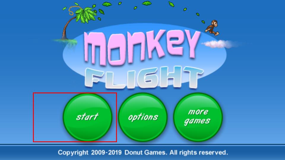 1、點擊紅色邊框包裹的綠色start按鈕,正式進(jìn)入Monkey Flight的叢林冒險世界,操控活潑猴子開啟飛行收集挑戰(zhàn)。