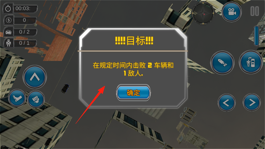 1、進(jìn)入游戲在主界面上會(huì)有本輪目標(biāo)任務(wù)出現(xiàn),規(guī)定時(shí)間內(nèi),擊敗2輛車、1敵人,開局點(diǎn)確定接任務(wù)。