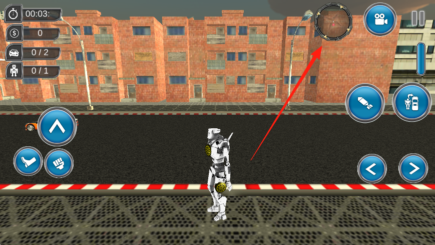 2、在過程當(dāng)中可以使用用虛擬按鍵控制機(jī)器人移動(dòng)、攻擊,小地圖找目標(biāo),點(diǎn)擊車輛圖標(biāo)召喚載具輔助。