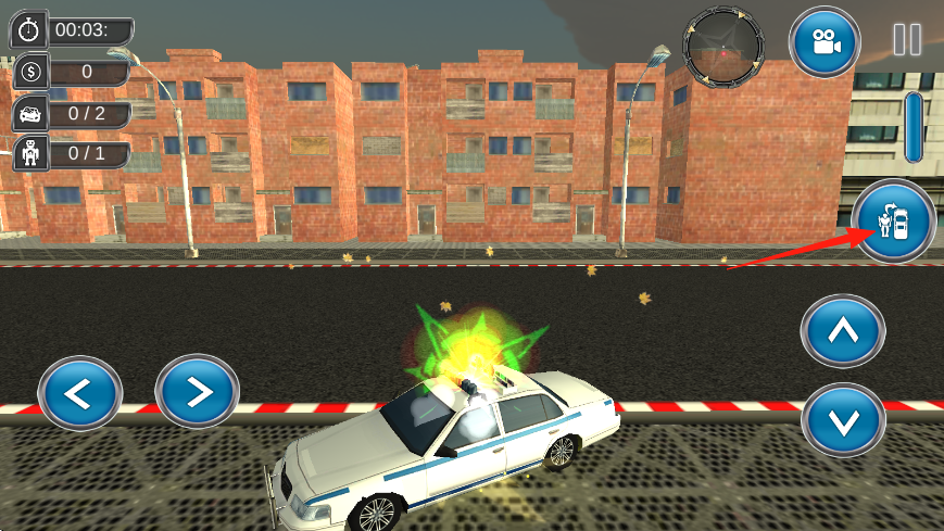 3、在城市街道場(chǎng)景,根據(jù)紅色箭頭指示,可以把角色隨意切換車子或機(jī)器人形態(tài),摧毀指定車輛、消滅敵人,完成任務(wù)進(jìn)度。