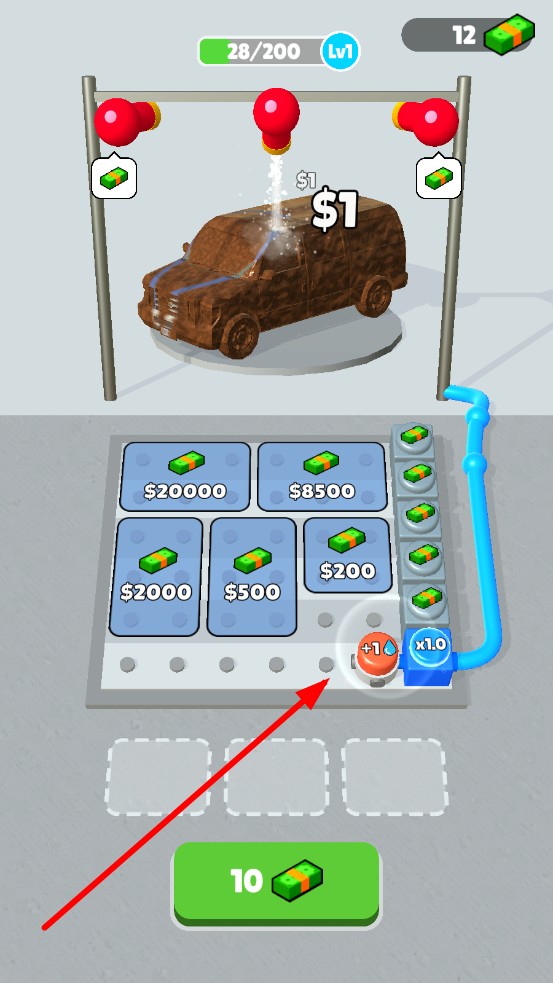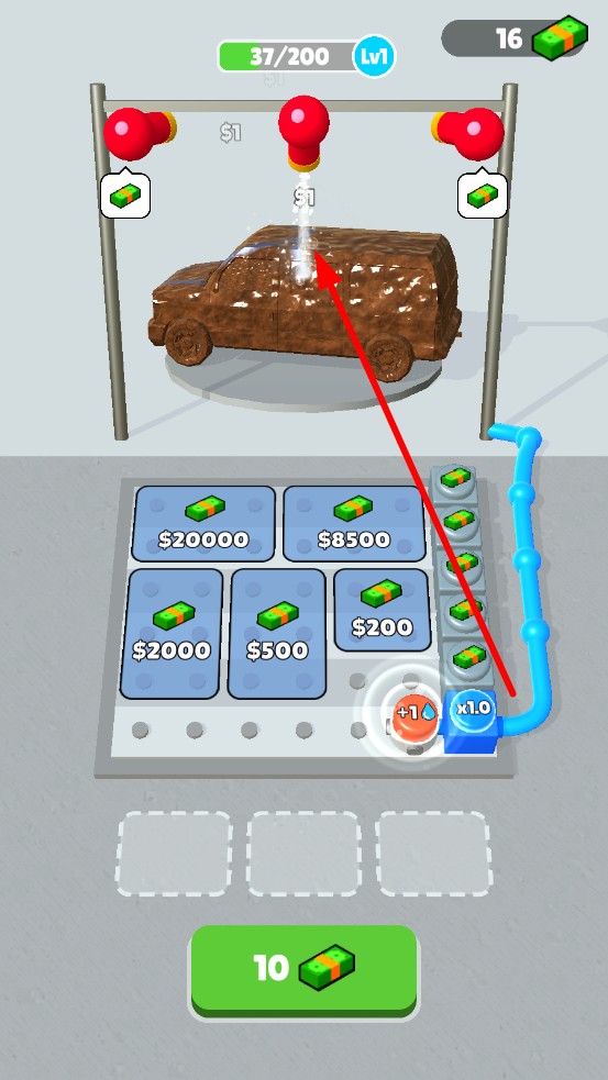 1、使用金幣,升級(jí)水滴,點(diǎn)擊x1.0的按鈕,同步產(chǎn)出金幣與水滴,快速湊齊啟動(dòng)資金,逐步解鎖高壓噴頭。