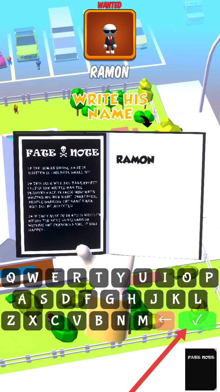 1、在FATE NOTE的中輸入通緝犯RAMON的名字,然后確認(rèn)點(diǎn)擊右下角對勾,觸發(fā)筆記規(guī)則。