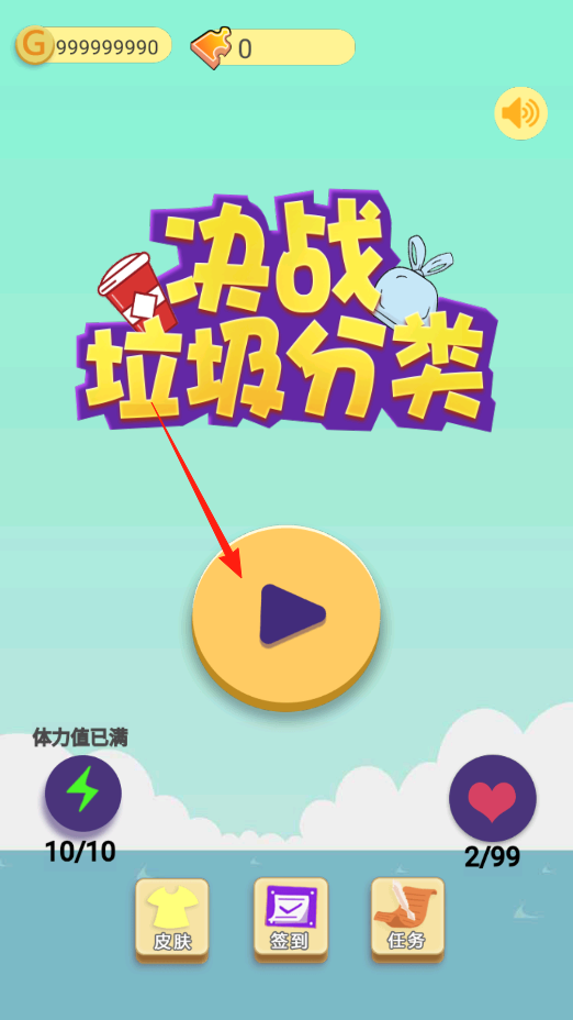 1、打開游戲,看到?jīng)Q戰(zhàn)垃圾分類標(biāo)題和播放按鈕,點黃色按鈕,進(jìn)入垃圾分類關(guān)卡,用金幣和體力值,開始挑戰(zhàn),把垃圾正確分類,贏取獎勵。