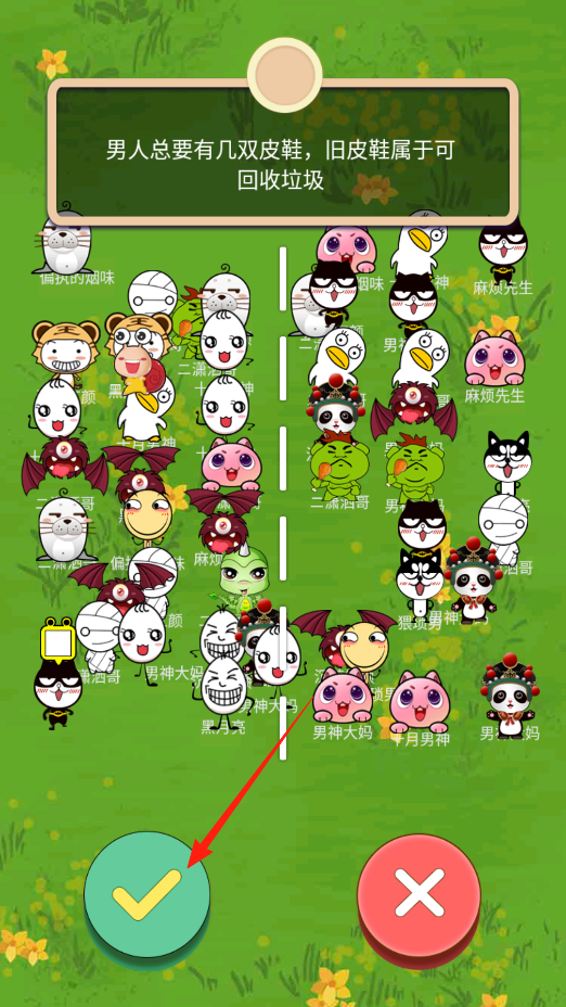 2、進(jìn)入關(guān)卡,屏幕上方有垃圾分類題目,說舊皮鞋是可回收垃圾,在兩邊卡通角色里,找出代表可回收垃圾的,選好后點綠色對勾按鈕,正確就得分,錯了重新選,考驗分類知識。