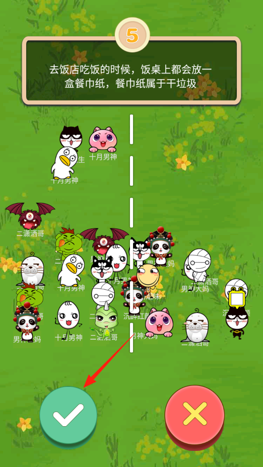 3、新關(guān)卡題目是餐巾紙屬于干垃圾,同樣在卡通角色中,找對應(yīng)干垃圾的代表,確定后點綠色對勾,答對繼續(xù)下一題,答錯重來,邊玩邊學(xué)垃圾分類,積累知識。
