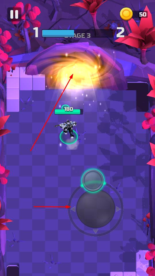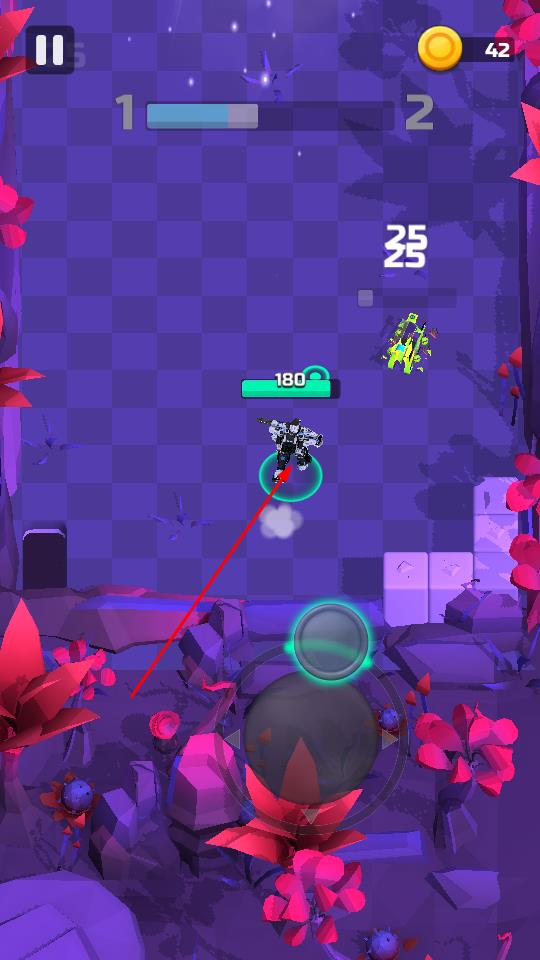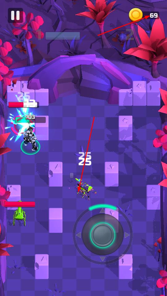 1、通過底部輪盤操控機(jī)甲移動(dòng),瞄準(zhǔn)場景內(nèi)綠色敵人射擊,同步收集金幣,關(guān)注上方關(guān)卡進(jìn)度條與機(jī)甲血量值,正式進(jìn)入戰(zhàn)斗流程。