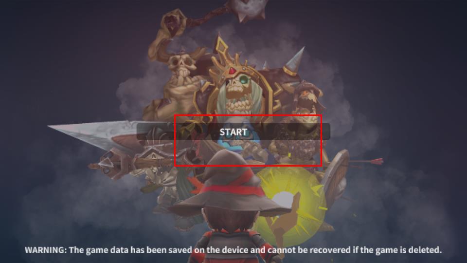 1、點(diǎn)擊界面START按鈕開啟游戲,留意底部提示:游戲數(shù)據(jù)存儲(chǔ)于設(shè)備,刪除后無法恢復(fù),正式進(jìn)入第一關(guān)地牢冒險(xiǎn)。