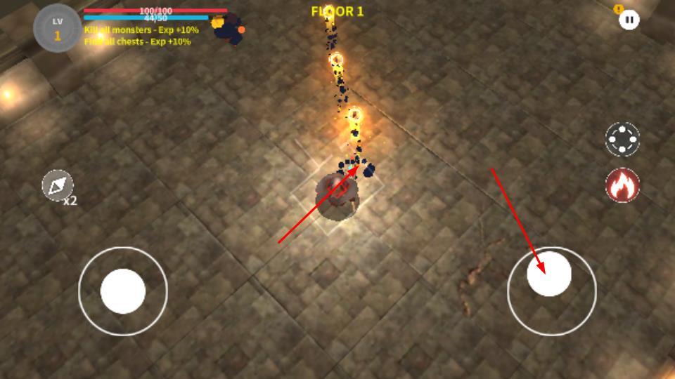 2、戰(zhàn)斗時(shí)左側(cè)搖桿操控角色移動(dòng),右側(cè)技能鍵如火焰圖標(biāo)釋放技能,攻擊怪物,收集其掉落物,應(yīng)對地牢場景挑戰(zhàn)。
