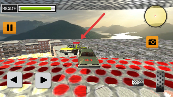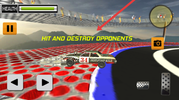 1、游戲開局界面顯示撞擊并摧毀對(duì)手任務(wù),操控賽車通過右側(cè)油門、方向按鍵,主動(dòng)追擊賽道上的敵方車輛。