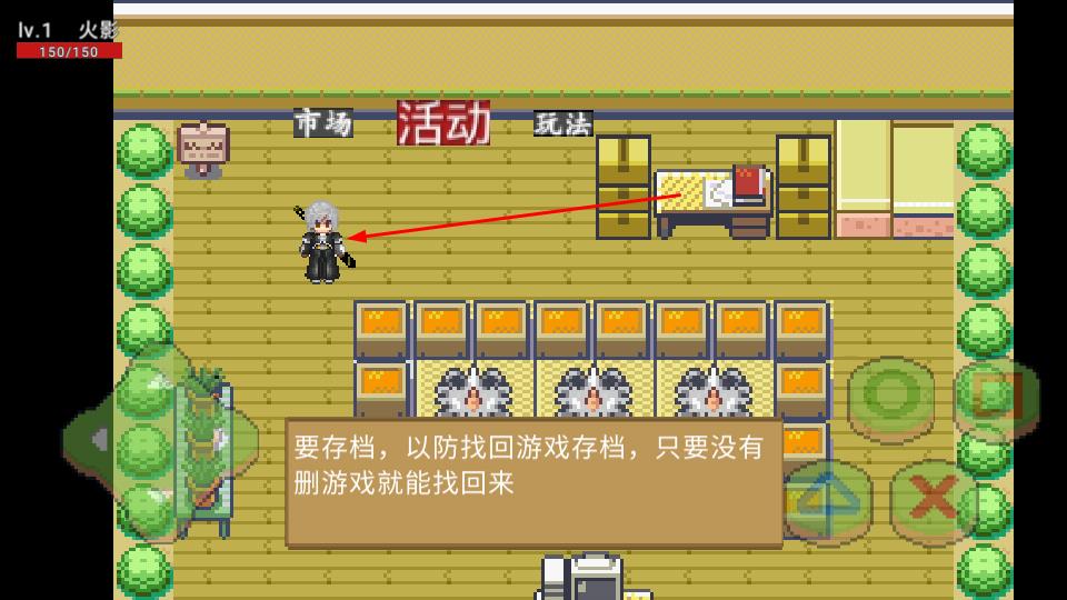 2、操控Lv.1角色火影血量150/150在場(chǎng)景移動(dòng),界面上方市場(chǎng),活動(dòng),玩法欄可交互,留意存檔提示,及時(shí)存檔防進(jìn)度丟失。