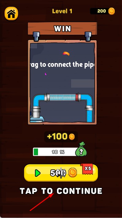 3、成功連接管道,水流注入右側(cè)容器消滅怪物后,點(diǎn)擊TAP TO CONTINUE進(jìn)入下一關(guān)。