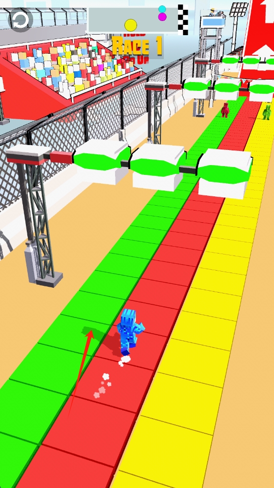 2、游戲中,操控方塊英雄,沿跑道躲避障礙,靈活沖刺,爭(zhēng)取領(lǐng)先,點(diǎn)擊屏幕人物跑動(dòng)。