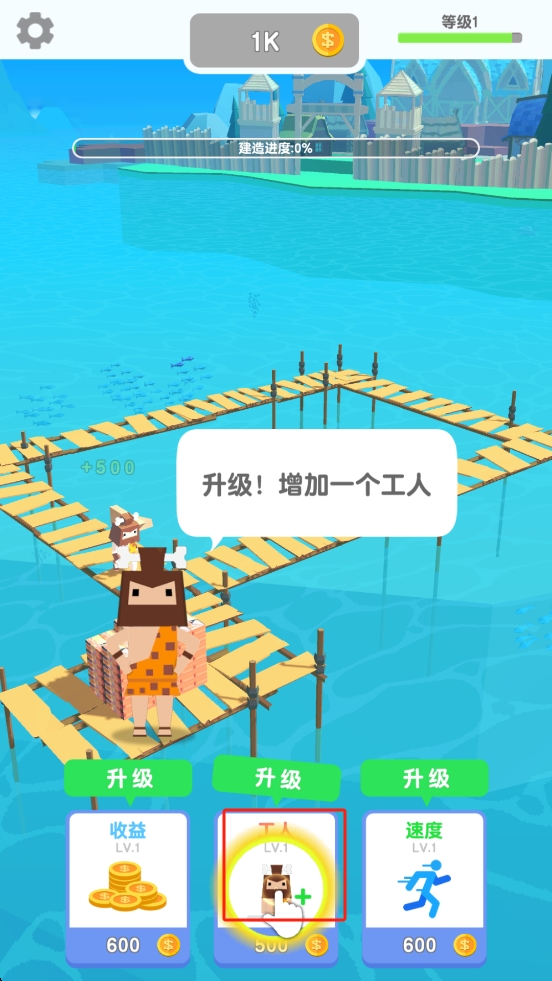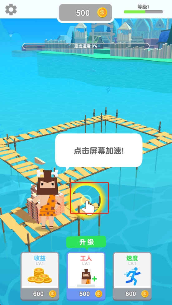 1、進(jìn)入作品后,我們點(diǎn)擊屏幕紅框處,按提示加速建造,讓原始人角色更快推進(jìn)木橋建造進(jìn)度,積累金幣。