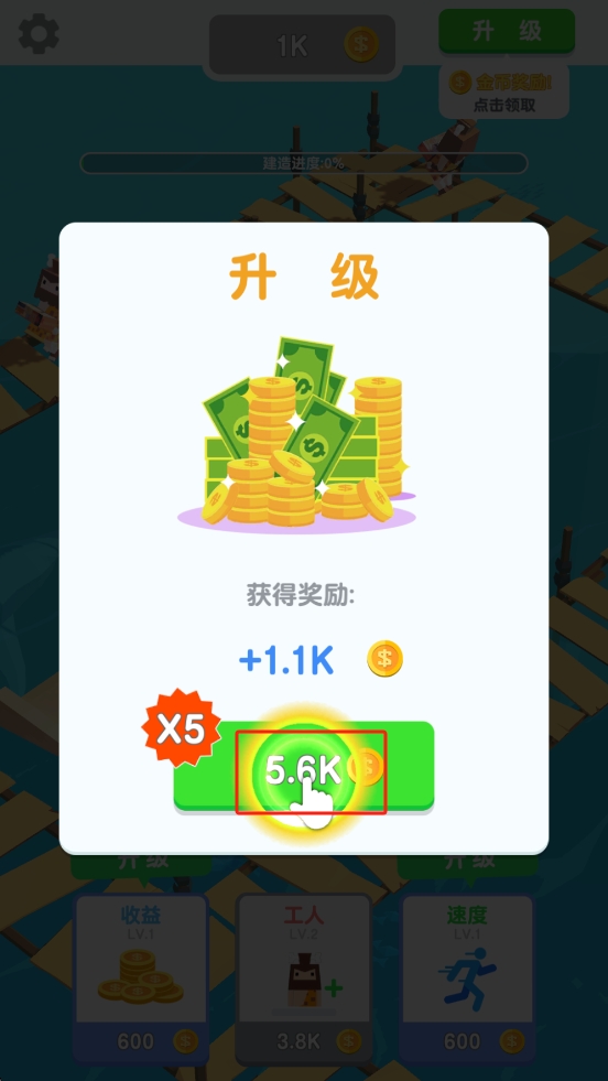 3、升級(jí)后彈出獎(jiǎng)勵(lì)界面,點(diǎn)擊綠色5.6K按鈕,領(lǐng)取1.1K金幣獎(jiǎng)勵(lì),可通過(guò)看廣告乘5翻倍,用于后續(xù)升級(jí)建筑、工人等。