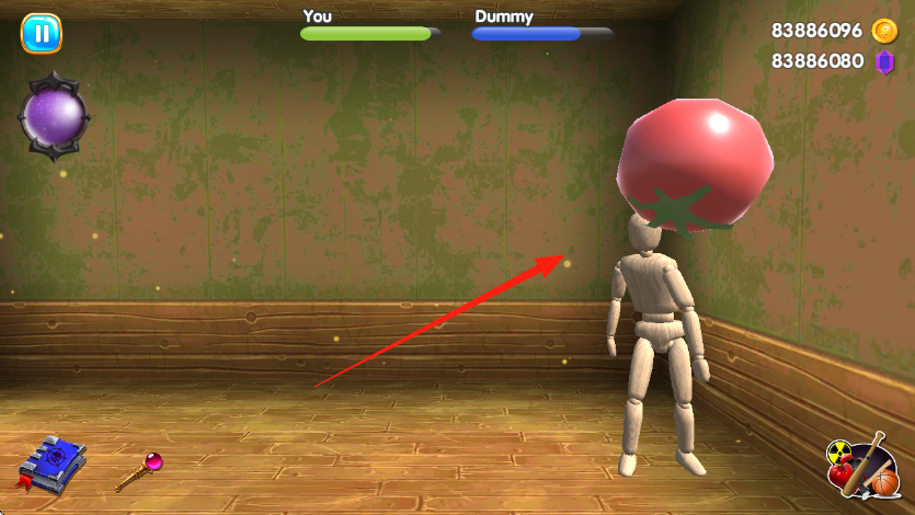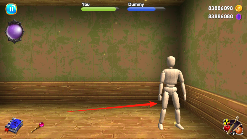 2、切換攻擊方式,讓木偶移動,避其動作,換道具如魔法棒,持續(xù)打擊,降低Dummy血量,通關。