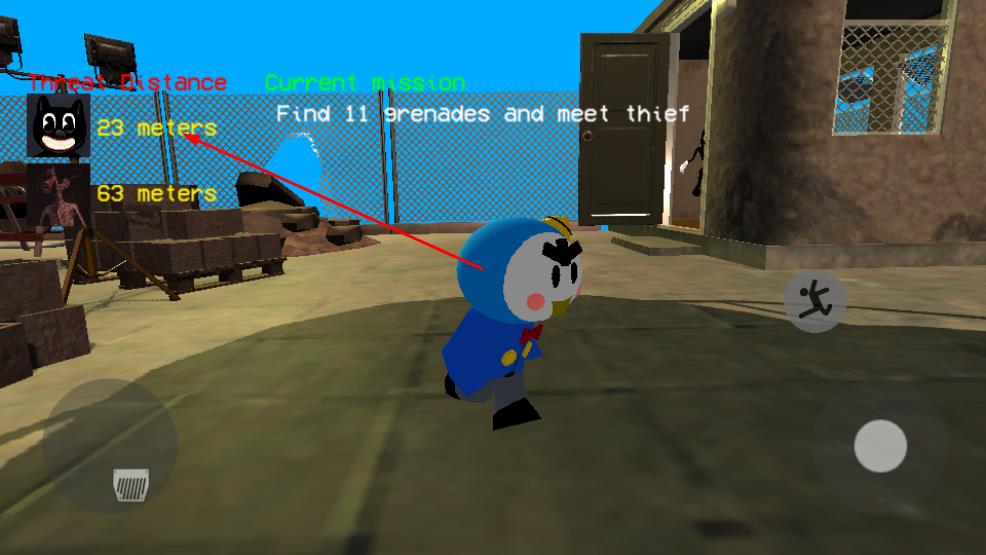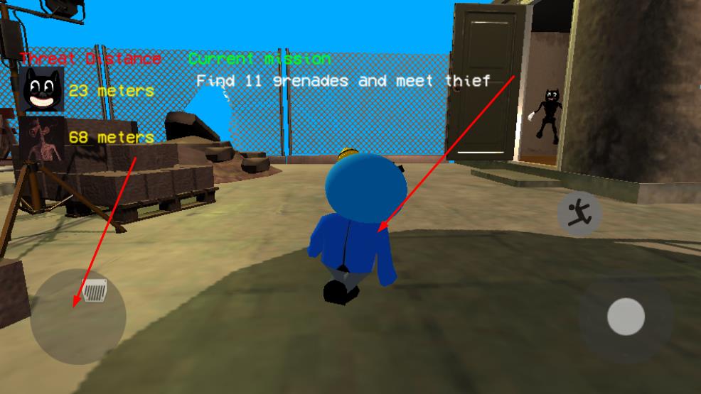 2、通過左下角虛擬搖桿操控藍(lán)色角色移動,探索場景收集手榴彈,遭遇黑色怪物等威脅時,利用場景掩體或靈活走位躲避,避免被攻擊。