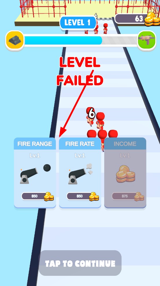 3、若對(duì)決失敗,界面顯LEVEL FAILED,進(jìn)入升級(jí)界面,消耗金幣強(qiáng)化炮臺(tái)射程、射速,逐步提升碾壓實(shí)力。