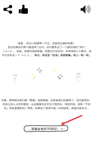 1、進(jìn)行博弈選擇:用戶在游玩中面臨關(guān)于硬幣是否給予對(duì)方等選擇,每一次決策都會(huì)影響后續(xù)發(fā)展,需根據(jù)情況做出判斷,參與欺詐與合作的博弈。