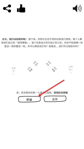 3、面對(duì)與五名玩家游戲的新環(huán)節(jié),依據(jù)指引,在欺騙和合作中選擇第一個(gè)策略,推進(jìn)游戲的基本的流程。