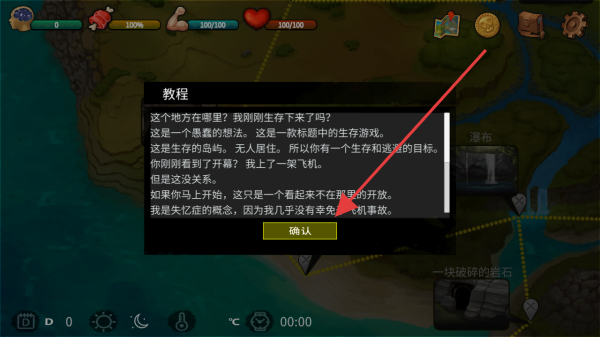 1、進(jìn)入游戲,閱讀教程,了解空難流落島嶼背景,點(diǎn)擊確認(rèn),開啟生存冒險(xiǎn),明確存活與逃脫目標(biāo)。