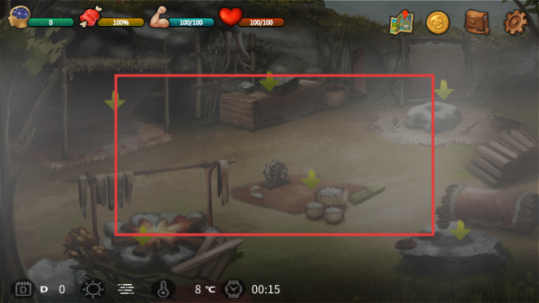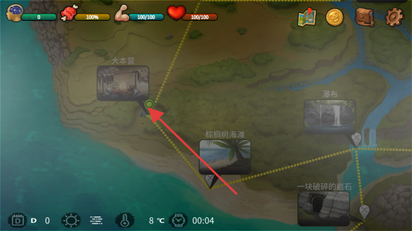 2、在地圖,優(yōu)先前往大本營(yíng),探索場(chǎng)景,收集紅框內(nèi)物資木材、食物 ,補(bǔ)充生存資源,提升飽腹、生命值,保障存活。