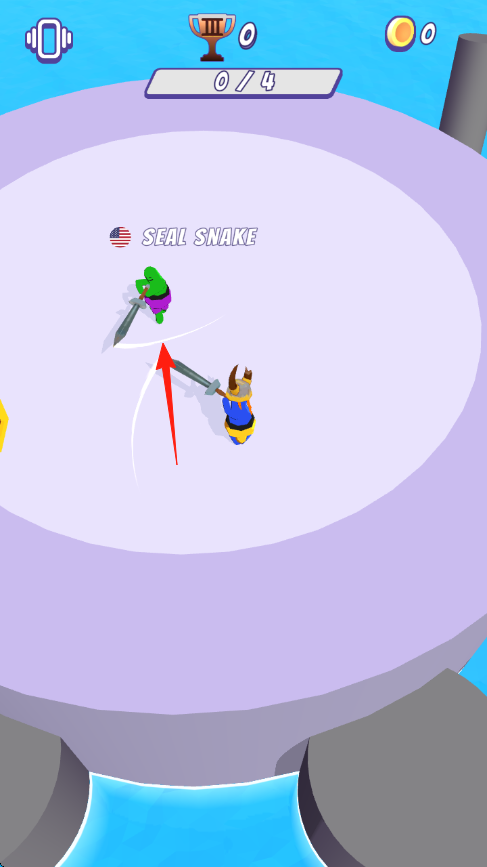 3、拖屏控移動(dòng),點(diǎn)攻擊鍵出劍,優(yōu)先追落單敵人,避集火,利用場(chǎng)地邊緣圓形繞后,多淘汰對(duì)手,完成0/4到4/4,贏獎(jiǎng)杯、金幣。