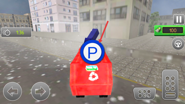 2、遇到停車標(biāo)識(shí)P圖標(biāo)區(qū)域,平穩(wěn)駕駛垃圾車駛?cè)?,完成停靠交互,獲取任務(wù)獎(jiǎng)勵(lì)如金幣增加。