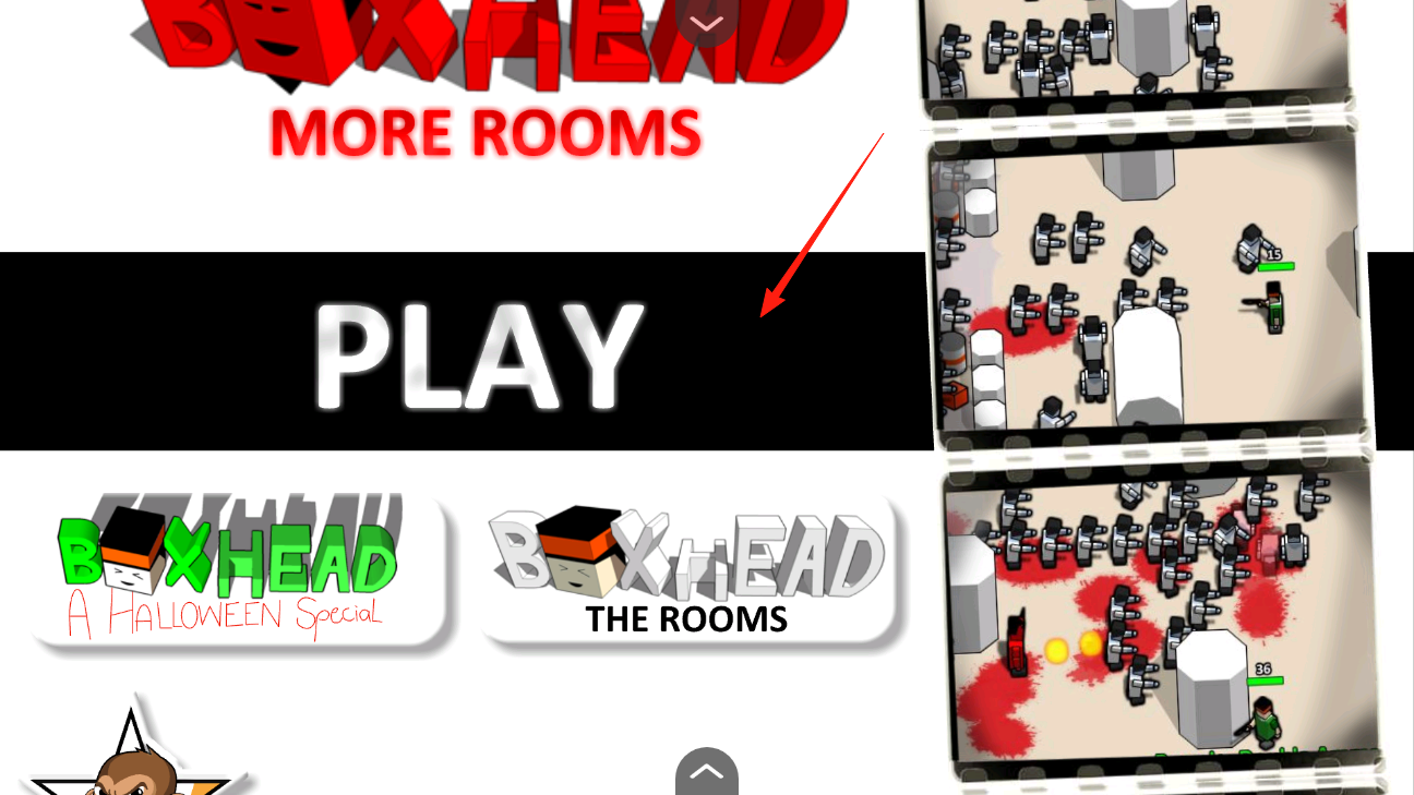 1、點PLAY按鈕就能開始經(jīng)典房間模式,想玩萬圣節(jié)特別版就選左邊綠色圖標(biāo),右邊預(yù)覽窗實時展示游戲?qū)崨r,那個36數(shù)字是玩家當(dāng)前血量,注意避開黑色僵尸群才能存活更久。